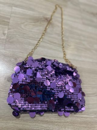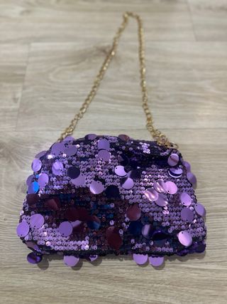 MÁS COSAS EN MI PERFIL 🩷 Bolso llamativo con lentejuelas brillantes. *NUEVO* tipo: CLUTCH - Medidas fabricante: Alto : 16cm Profundidad: 1cm Ancho: 22,5 cm - Diseño con lentejuelas moradas y detalles dorados. - Cadena dorada para llevar al hombro o cruzado.