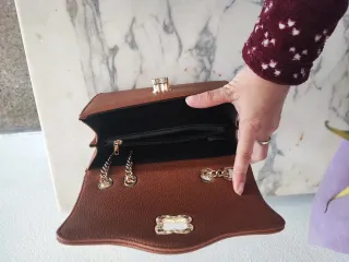 Elegante cartera de mano con un diseño sofisticado. - Acabado texturizado en tono marrón. - Adornos metálicos en color dorado en las esquinas. - Detalle central con incrustaciones. - Cadena dorada para llevarla al hombro o cruzada.