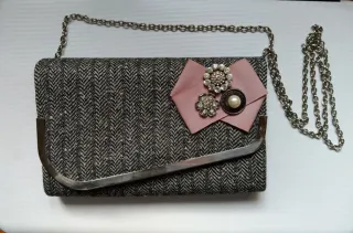 Elegante bolso cartera con un diseño de tela texturizada tipo cheviot de lana y detalles decorativos. - Forro interior de tela. - Cadena metálica para llevar al hombro o cruzado. - Adornos de pedrería y perla en la solapa. - Cierre de solapa con broche metálico.