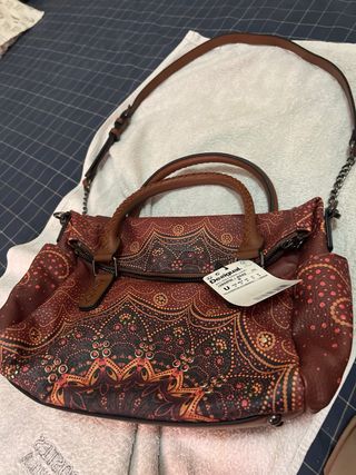 Bolso de piel de la marca Desigual, sin estrenar. - Diseño con estampado. - Asas de mano y cadena. - Cierre de cremallera. preciosa esa estampado de mandala está bien tienes la cartera aj juego estoy en mi escaparate si aquí quisiera dos cosas la era una gran oferta? te
