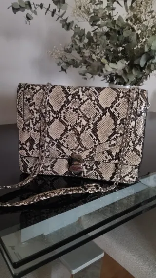 Bolso de mano con estampado de serpiente. Puede llevarse también como cartera. Sin Estrenar - Cierre de solapa con broche metálico. - Cadena metálica para llevar al hombro o cruzado.