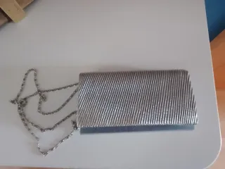 Elegante bolso cartera para eventos especiales. Plateado. Muy fino y bonito. Diseño con líneas verticales. Cadena metálica para llevar al hombro o cruzado. Va con su bolsita de tela