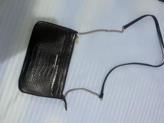 Bolso negro pequeño tipo baguette con cadena plateada decorativa y correa larga ajustable. ✨ Diseño minimalista y muy combinable ✨ Cierre con cremallera ✨ Ligero y cómodo para salir ✨ Perfecto para looks casual, fiesta o estilo urbano Está en muy buen estado, apenas usado. Ideal para llevar lo básico: móvil, llaves, gloss y cartera pequeña.