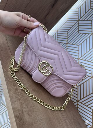 Elegante bolso de mano moderno en tono rosa, con un diseño acolchado y detalles dorados. - Diseño Chevron. - Logo dorado. - Cadena dorada para llevar al hombro. Mide 2cm