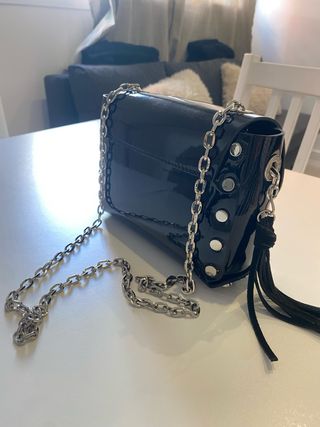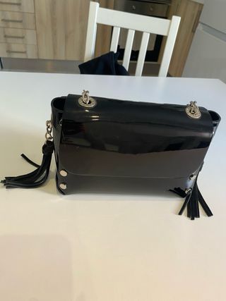 Elegante bolso de charol negro con detalles metálicos y cadena. - Acabado brillante. - Cadena metálica para llevar al hombro o cruzado. - Adornos de tachuelas. - Flecos decorativos.