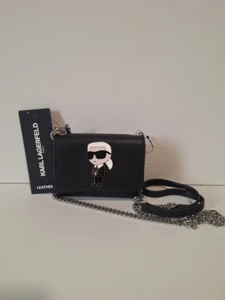 Elegante cartera monedero de la marca Karl Lagerfeld. - Diseño con el icónico personaje de Karl Lagerfeld. - Cadena metálica para llevar al hombro o cruzada. - Cierre de solapa.