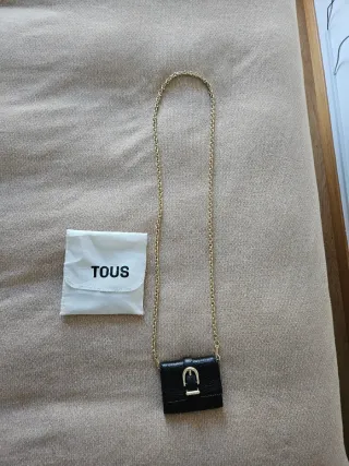 Pequeña cartera de la marca Tous, ideal para llevar lo esencial. Viene con su bolsa guardapolvo. - Diseño elegante con cierre de hebilla. - Cadena dorada para llevar al hombro o cruzada. - Incluye bolsa guardapolvo de la marca.