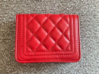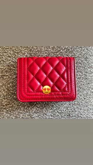 Conjunto de tres piezas - Bolso con cadena dorada. - Cartera con cremallera y forro rojo. - Tarjetero rojo con ranuras.