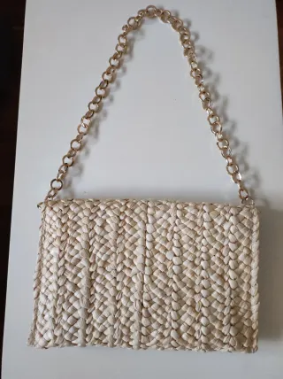 Bolso cartera de rafia con cadena dorada. - Cierre de solapa. - Diseño tejido. - Cadena metálica para llevar al hombro o cruzado. -Con tres bolsillos interiores,uno de ellos con cremallera. -Forro interior. -Dos puestas. -27 cm de largo x 18 cm de ancho.