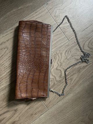 Elegante cartera de mano con buena calidad Mide 21 cm por 13 alto - Acabado en tonos marrones y dorados. - Cadena metálica para llevar al hombro o cruzada.( Se puede quitar)
