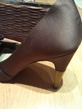 JUEGO DE ZAPATOS DE SALON,EN RASO MARRÓN,CON DETALLE DE LAZO,TACON DE 10CM,MUY COMODOS,N 36+ CARTERA EN RASO MARRON AL IGUAL QUE LOS ZAPATOS,CON CADENA,PARA LLEVAR EN HOMBRO Y EN MANO,EN PERFECTO ESTADO,MUY POCO USO,IDEAL PARA FIESTAS,EVENTOS..