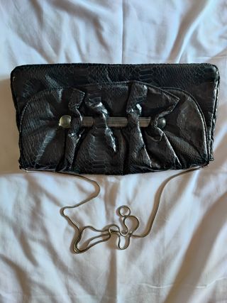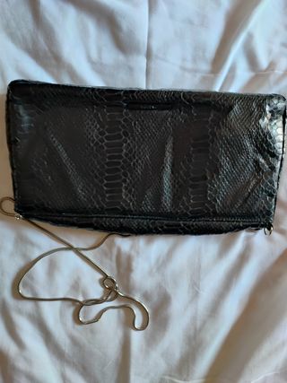 Bolso tipo cartera, alargado. Tipo de piel como pitón. Tiene cadena larga plateada y se puede usar con pulsera de mano. Medidas ancho 31 alto 14 cm. Tiene un bolsillo interior con cremallera.