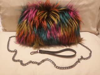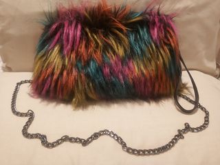 Pelo largo multicolor. Con una cadena larga metálica para llevar como bolso o una corta para llevar como cartera. Aporta un toque desenfadado. En perfectas condiciones.