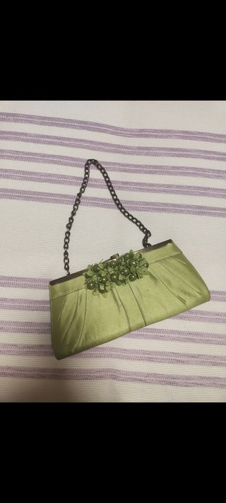 Cartera de mano para eventos color verde lima. Tiene cadena para colgar. un poco sucia de sudor, pero usada en 2 ocasiones