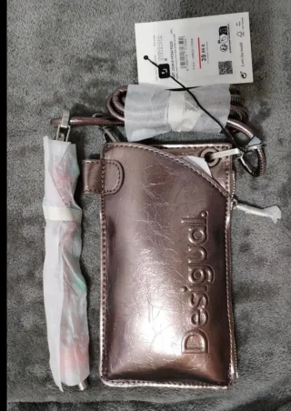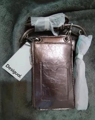 Bolso tipo cartera de la marca Desigual, perfecto para llevar tu móvil. - Diseño en acabado metalizado. - Logo de la marca en relieve. - Incluye cadena para colgar.