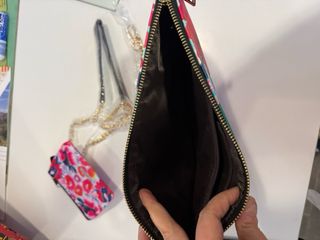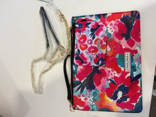 Conjunto de cartera de mano y monedero a juego con un vibrante estampado floral. - Diseño multicolor con detalles en rojo. - Incluye correa de cadena dorada y correa de mano
