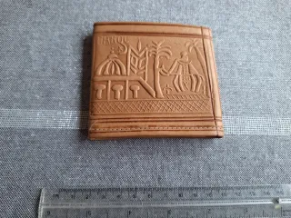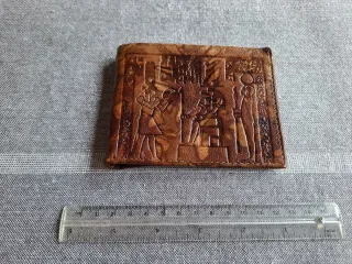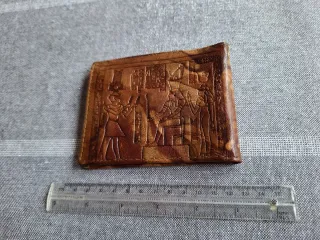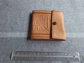 Cartera artesanal de cuero con un diseño único.a estrenar.mide 15.5 cm por 10.5 cm - Elaborada a mano en Las Dalias, Ibiza. - Posee un grabado detallado en la parte frontal. - Costuras visibles en el lateral.