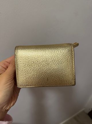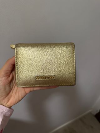 Elegante cartera de cuero en tono dorado. - Diseño compacto y práctico. - Acabado texturizado.