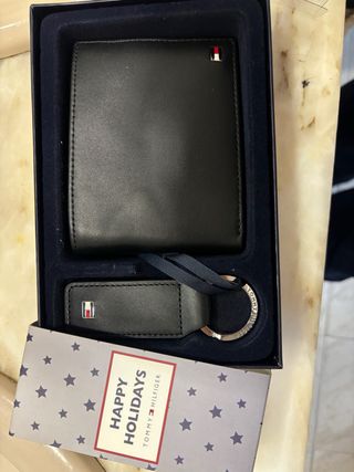 Conjunto de cartera y llavero de la marca Tommy Hilfiger. - Cartera de cuero negra. - Llavero a juego con detalle de la marca. - Presentado en caja de regalo.
