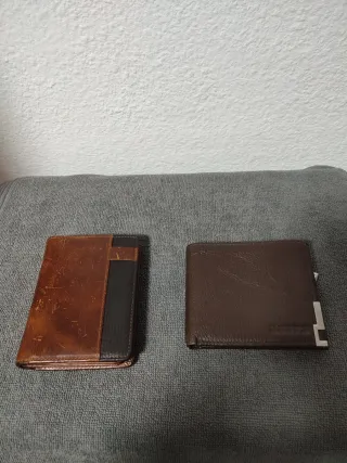 7€ la unidad Conjunto de dos carteras para hombre. - Cartera de cuero marrón con diseño vertical. - Cartera de cuero marrón con detalle metálico y logo kavi's.
