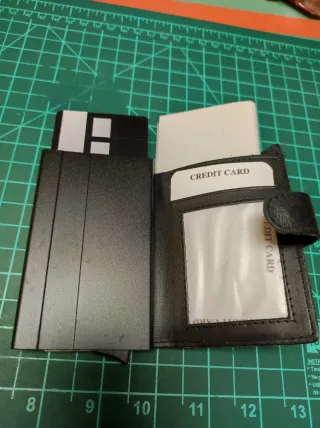 Cartera para hombre con dispensador automático con boton para las tarjetas - Color azul oscuro - Material de cuero sintético - Dispensador tarjetas aluminio con boton - Bastante espacio y varios departamentos - En muy buen estado, no se ha usado a penas