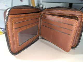 Elegante cartera de cuero. - Material: Cuero genuino. - Color: Marrón. - Cierre de seguridad metálico. - Asa superior para un transporte cómodo. La cremallera de la parte posterior va un poco dura. Por el resto el producto está muy bien.