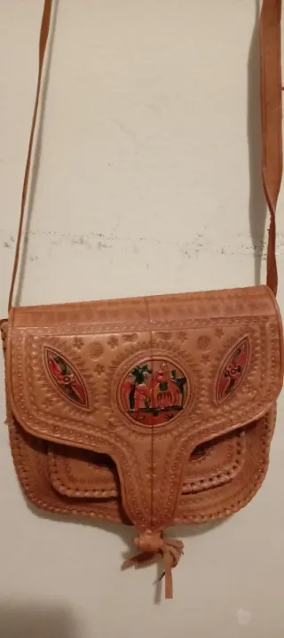 Bolso de cuero con un diseño único y detalles artesanales. - Elaborado en cuero. - Adornado con un diseño central y detalles laterales. - Cierre de solapa. - Correa para llevar al hombro.