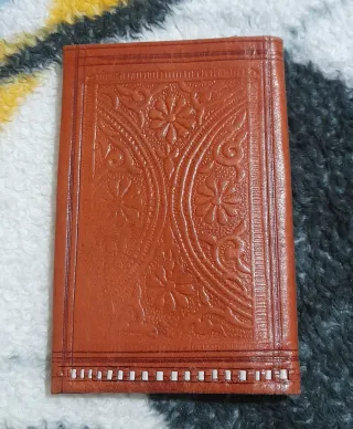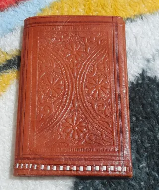 Cartera vintage de cuero con diseño repujado. - Material: Cuero genuino. - Diseño: Motivos florales y ornamentales repujados. - Borde inferior: Detalle de líneas y pequeños cuadrados blancos.