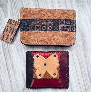 Vendo 2 carteras/tarjeteros pequeños, son nuevos y sin estrenar. Tarjetero de Corcho Natural (Corteça by Angelina): Corcho ecológico de alta calidad con un elegante detalle de azulejos azules. Cremallera perimetral reforzada para máxima seguridad. Cartera Artesanal de Cuero (Estilo Patchwork): Diseño: Combinación de cuero auténtico en tonos tierra y rojo con aplique de mariposa. Dispone de varias ranuras para tarjetas y un original compartimento transparente con forma de toro para el DNI o fotos.