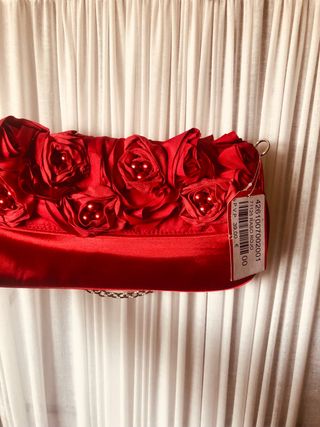 Cartera de fiesta sin estrenar, en raso color rojo y con adorno de flores y perlas. Se puede llevar con o sin cadena. Está muy rebajado porque lleva una pequeña mancha en una esquina por detrás, que apenas se ve. Mide 30x15 cm