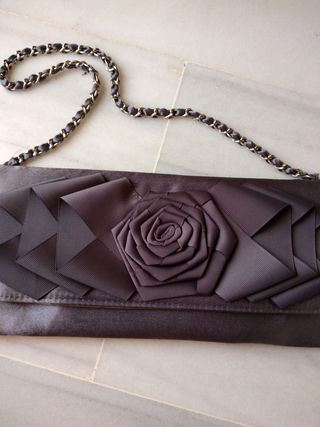 Bonito bolso de fiesta tela brillante. Con detalle de flor con lentejuelas. Tipo cartera. Buen estado