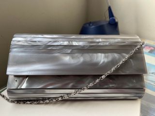 Bolso de fiesta en plata , se puede llevar como cartera o con la correa metálica tipo bandolera, con bolsillo interior