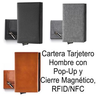 Cartera Hombre Pequeña con Pop-Up y Cierre Magnético, RFID/NFC. Capacidad para 9 Tarjetas, 8 Billetes, Monedero con Cremallera, 100x63x20 mm. Tres colores disponibles: cuero negro texturizado, cuero marrón liso y tejido vaquero gris. Caja Precintada, Totalmente nuevo, en su embalaje original. SIN ESTRENAR - Formato compacto, moderno y gran capacidad - Acceso rápido Pop-up para tarjetas - Seguridad RFID/NFC inteligente. - Cuero vegano (piel sintética). - Cierre magnético. - Lista para regalar en caja regalo. -PRECIO POR UNIDAD. -TOTALMENTE PRECINTADO, A ESTRENAR.571.r23 Ver todas las fotos ✅Hago envíos Wallapop