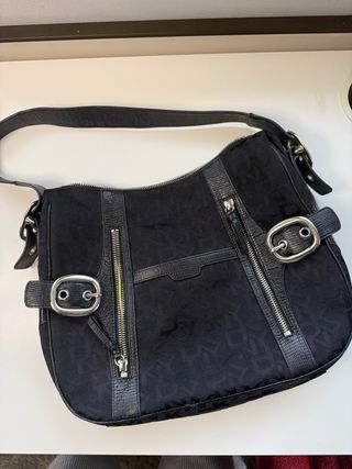 Bolso DKNY de color negro, con un diseño moderno y elegante. Incluye una cartera a juego. - Compartimentos exteriores con cremallera. - Hebillas metálicas decorativas. - Correa ajustable para el hombro. - Cartera DKNY a juego. interior verde
