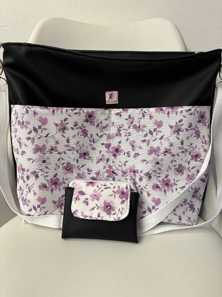 Conjunto de bolso y cartera a juego con un bonito estampado floral. - Bolso de polipiel. - Cartera a juego. - Diseño floral en tonos morados y blancos.
