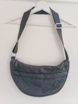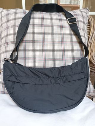 Bolso bandolera de color negro, ligero y muy cómodo para el día a día. Fabricado en tejido tipo nylon acolchado, suave al tacto y resistente. Diseño semicircular moderno y práctico, fácil de combinar con cualquier estilo. Cuenta con asa ancha ajustable, lo que permite llevarlo cómodamente al hombro o cruzado. El cierre superior es con cremallera, manteniendo el contenido seguro. Interior amplio para lo esencial: móvil, cartera, llaves, etc. Se encuentra en muy buen estado, con signos normales de uso pero sin roturas, manchas ni desperfectos visibles. Cremalleras y enganches en perfecto funcionamiento. Ideal para uso diario, viaje