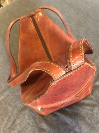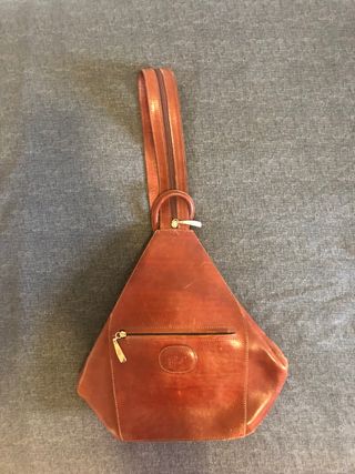 Versátil mochila-cartera de auténtica piel con un diseño triangular. Posibilidad de portar con dos correas a la espalda o unificarla por cremallera y llevarla en un hombro. - Correa ajustable con cremallera. - Bolsillos tres, con cremalleras, uno central y dos laterales. - Detalle de logo circular en relieve. 26€.