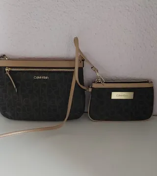 Conjunto de bolso bandolera y cartera a juego de Calvin Klein. Como nuevo. Medidas bolso bandolera: 23x17 cm Medidas cartera: 18x12 cm. - Diseño con monograma de la marca. - Combinación de colores marrón y beige. - Incluye correa para el bolso bandolera. Se venden también por separado. Más regalos de firmas en mi perfil. El precio es por los dos: 50 € Sólo entrega en mano.