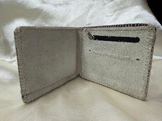 Elegante billetero para hombre con un diseño texturizado. Pequeño arañazo se ve en la última foto. Mide 12x 9.5 cms - Material: Cuero sintético. - Color: Negro y gris. - Diseño: Patrón de rombos pequeños.