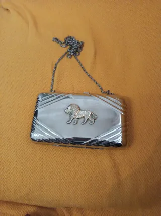 Cartera de mano plateada con león vintage