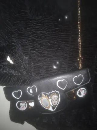 Bolso cartera con diseño inspirado en Blancanieves. -Diseño único dibujado a mano. - Adornos de corazones y personajes. - Cierre dorado. - Cadena dorada para llevar al hombro.