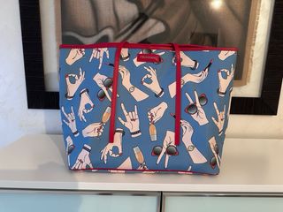 Conjunto de bolso de hombro (40x32x20) y cartera de mano Trussardi con un divertido estampado. - Estampado de manos y accesorios. - Forro interior en color rojo. - Incluye cartera a juego. - No tiene ni una marca ni roce, el precio en su día era más de 300€.