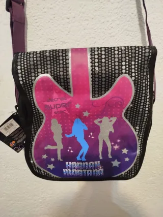Bolso cartera juvenil con diseño de guitarra y siluetas de baile. Nueva sin estrenar, con la etiqueta puesta. - Estampado de estrellas y detalles brillantes. - Personaje: Hannah Montana. - Correa ajustable para llevar al hombro.