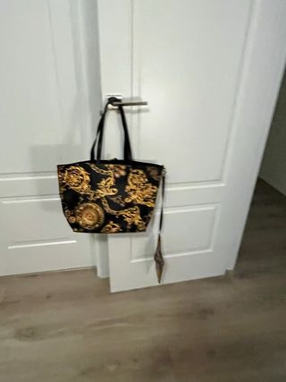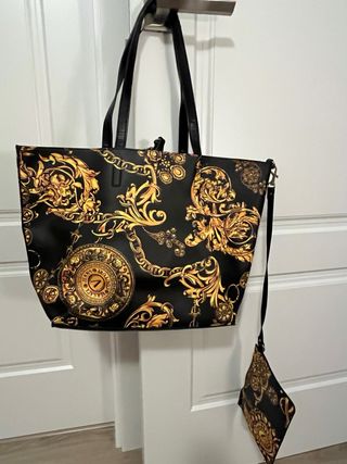 Elegante bolso reversible con un llamativo estampado. - Incluye una cartera a juego. - Diseño con detalles dorados sobre fondo negro. con su funda Versace para guardarlo. cuando lo pones del lado negro hay una última foto donde se ve que se abre un poco el lateral. Sólo de esa parte, por lo demás el bolso está perfecto.