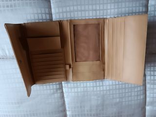 Con cremallera por dos lados. Dentro es verde oliva y tiene tres bolsillos con cremallera y varios compartimentos más. Delgada, de un centímetro de grosor aprox. Mide 25x19 cm. aprox. Nueva. Sin uso y en perfecto estado.