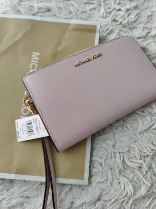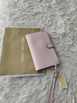 Cartera de la marca Michael Kors en tonos rosa y dorado. Incluye su bolsa original. - Diseño elegante y funcional. - Correa de mano. - Etiqueta de autenticidad.