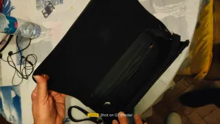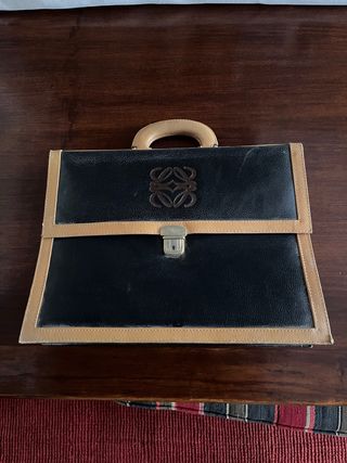 Elegante bolso Loewe de estilo vintage, perfecto para llevar documentos o como cartera. - Combinación de piel en negro y detalles en beige. - Asa superior de piel. - Cierre metálico central. - Tiene un pequeño desconchón en una esquina (ver fotos), el resto está muy bien. Entrega en mano o envío por Wallapop. Precio negociable con sentido. Si quieres medidas exactas o fotos detalladas, te las envío sin problema.