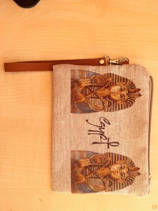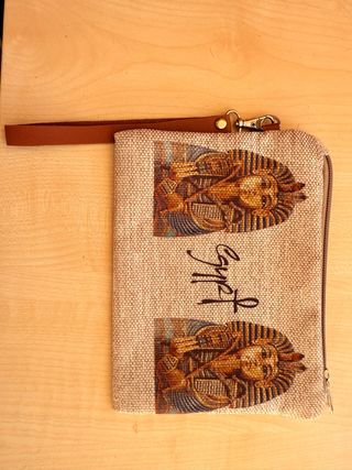Elegante cartera de mano con un diseño inspirado en el antiguo Egipto. Perfecta para llevar tus esenciales con estilo. - Acabado en tela con detalles de Tutankamón. - Cierre de cremallera. - Correa de mano de cuero.
