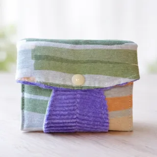 Pequeña cartera hecha a mano con un diseño único y colorido. - Confeccionada en tela de loneta estampada y tela de pana morada. - Cierre de botón. - Tres compartimentos. - Medidas: 11,5 x 10