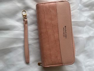 Cartera de mujer en color rosa, diseño elegante con efecto cocodrilo en la parte frontal. Incluye correa de mano desmontable con enganche dorado. Cuenta con doble cierre de cremallera, varios compartimentos internos у bolsillo con cremallera para monedas. Nueva, sin uso.